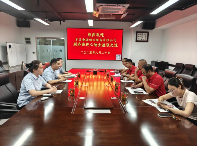 2025年8月20日下午,單縣金源物業(yè)服務(wù)有限公司經(jīng)理時海東等一行5人到濟南連心物業(yè)有限公司進行工作交流。連心物業(yè)黨支部副書記、總經(jīng)理曹立等參加此次交流接待活動。