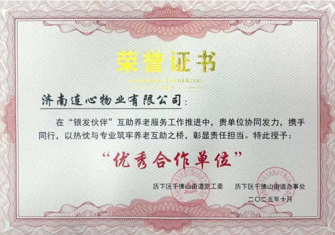 此次獲評(píng)“優(yōu)秀合作單位”是對(duì)濟(jì)南連心物業(yè)社會(huì)責(zé)任擔(dān)當(dāng)與務(wù)實(shí)精神的高度認(rèn)可。作為“銀發(fā)伙伴”項(xiàng)目的重要參與力量,連心物業(yè)充分發(fā)揮服務(wù)專業(yè)的優(yōu)勢(shì),積極整合資源、搭建互助平臺(tái)、組織為老活動(dòng),切實(shí)筑牢社區(qū)養(yǎng)老互助橋梁,助力該模式持續(xù)走深走實(shí),推動(dòng)養(yǎng)老事業(yè)與產(chǎn)業(yè)協(xié)同發(fā)展。