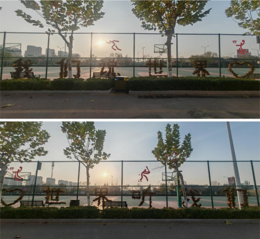 東籃球場圍欄上,保潔、綠化團(tuán)隊(duì)用棕褐落葉拼出“人文天下 精彩成長”的標(biāo)語,與球場活力相映;西籃球場“我們說世界,世界聽我們”字樣,則借落葉的自然質(zhì)感,傳遞出青春發(fā)聲的力量。路過師生們的每一聲美贊,都是對這份“藏在平凡里的溫?zé)帷弊钫鎿椿貞?yīng)。