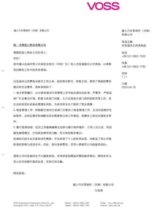 2025年4月18日,濟(jì)南連心物業(yè)有限公司收到來(lái)自福士汽車零部件(濟(jì)南)有限公司的表?yè)P(yáng)函,對(duì)濟(jì)南連心物業(yè)有限公司駐福士汽車零部件(濟(jì)南)有限公司中歐廠區(qū)項(xiàng)目部員工張強(qiáng)同志在工作中優(yōu)異表現(xiàn)給予高度贊揚(yáng)。此次表?yè)P(yáng)不僅是對(duì)員工個(gè)人的肯定,更是對(duì)連心物業(yè)服務(wù)品質(zhì)的充分認(rèn)可。