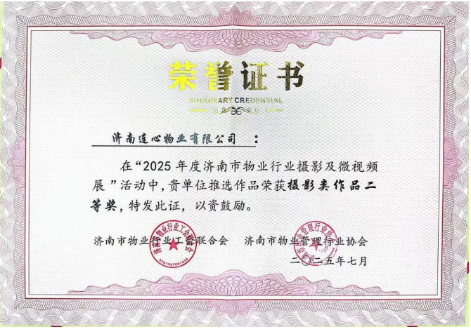 2025年7月23日,濟(jì)南市物業(yè)行業(yè)2025年度工會(huì)干部培訓(xùn)班暨攝影微視頻展表?yè)P(yáng)活動(dòng)在博鰲大廈舉行。濟(jì)南連心物業(yè)有限公司攝影作品《城市溫暖的傳遞》榮獲二等獎(jiǎng)。
