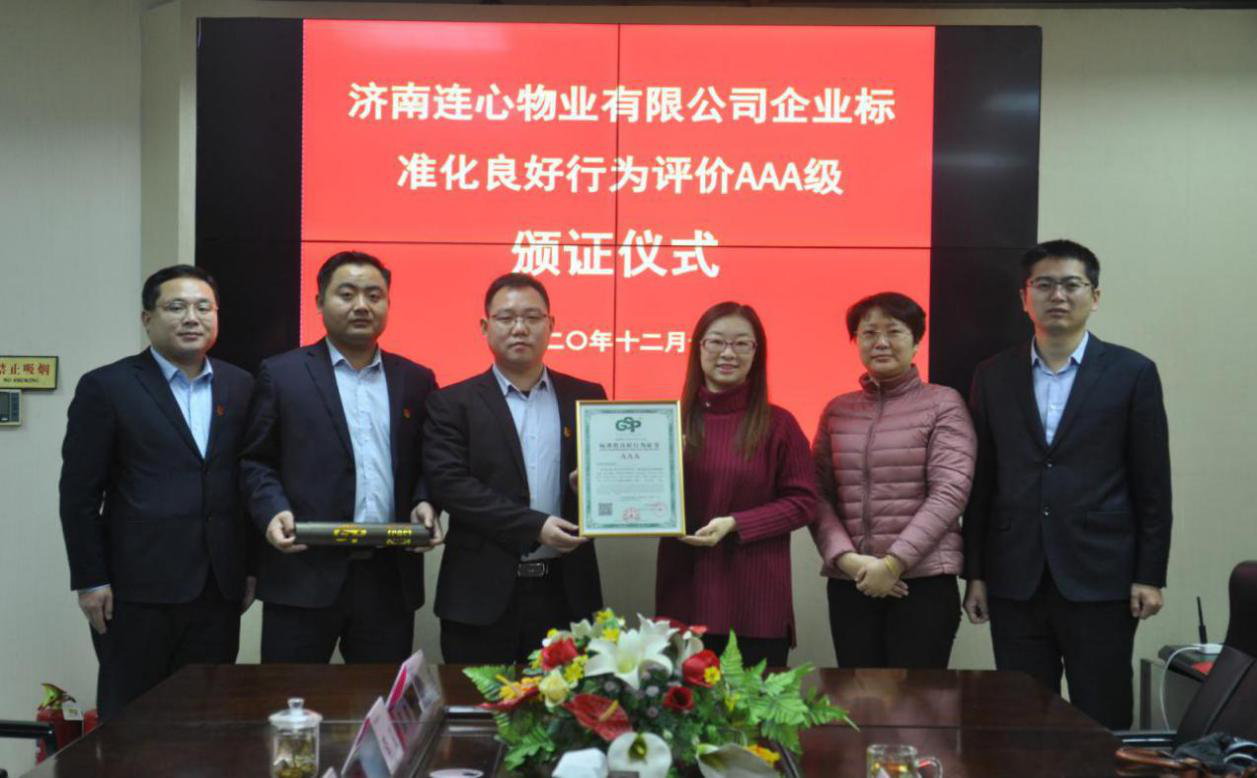 中國(guó)標(biāo)準(zhǔn)化協(xié)會(huì)向濟(jì)南連心物業(yè)有限公司頒發(fā)“AAA級(jí)標(biāo)準(zhǔn)化良好行為”證書(shū)