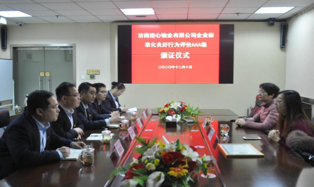 2020年12月10日上午,濟(jì)南連心物業(yè)有限公司企業(yè)標(biāo)準(zhǔn)化良好行為AAA級(jí)頒證儀式在連心物業(yè)會(huì)議中心隆重舉行,山東和賢科技服務(wù)有限公司總經(jīng)理、國(guó)家注冊(cè)標(biāo)準(zhǔn)化評(píng)價(jià)專(zhuān)家趙方女士、山東和賢科技服務(wù)有限公司姜靜靜女士、濟(jì)南連心物業(yè)有限公司黨支部副書(shū)記、總經(jīng)理孟令乾、副總經(jīng)理曹立、工會(huì)主席李寶建、總經(jīng)理助理李義等參加了本次頒證儀式。儀式上,中國(guó)標(biāo)準(zhǔn)化協(xié)會(huì)向濟(jì)南連心物業(yè)有限頒發(fā)“AAA級(jí)標(biāo)準(zhǔn)化良好行為”證書(shū),這標(biāo)志著濟(jì)南連心物業(yè)有限公司邁入了標(biāo)準(zhǔn)化、程序化、規(guī)范化、科學(xué)化的新發(fā)展階段。